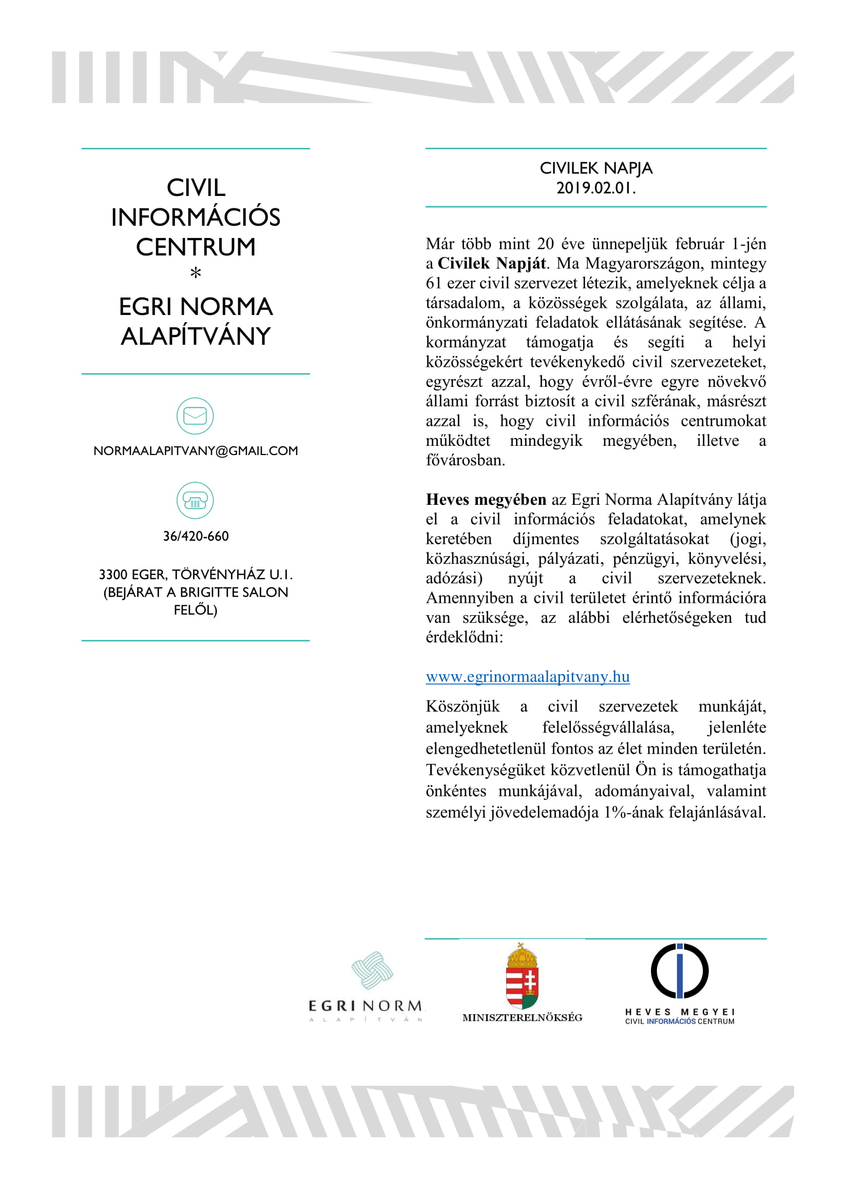 Idén február 1-jén 22. alkalommal ünneplik a Civilek Napját, melynek keretében délben egy élőláncot indítanak a Dobó tértől a Katona téri adománydobozig, egyesével átadva az abba szánt tartós élelmiszert. Ez szimbolizálja a civil szervezetek sokszínűségét és összefogásának erejét egy jó ügy érdekében.