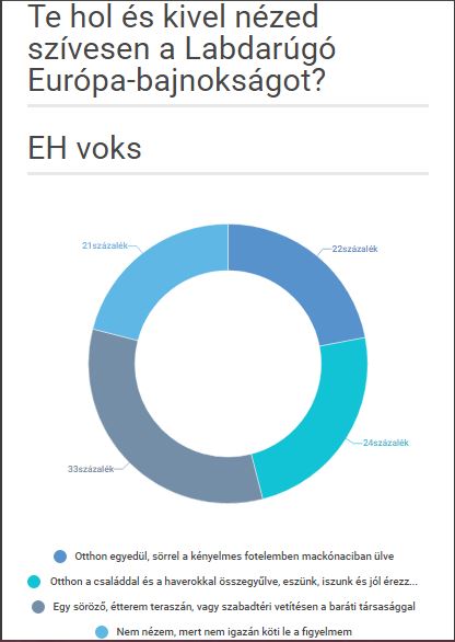 A szavazók 33 százaléka egy söröző, étterem teraszán, vagy szabadtéri vetítésen nézi szívesen a Labdarúgó Európa-bajnokságot a barátai körében. 24 százalékotok mondja azt, hogy otthon nézi, a családdal és a haverokkal összegyűlve. Ezalatt jókat esztek és isztok, közben pedig jól érezitek magatokat.