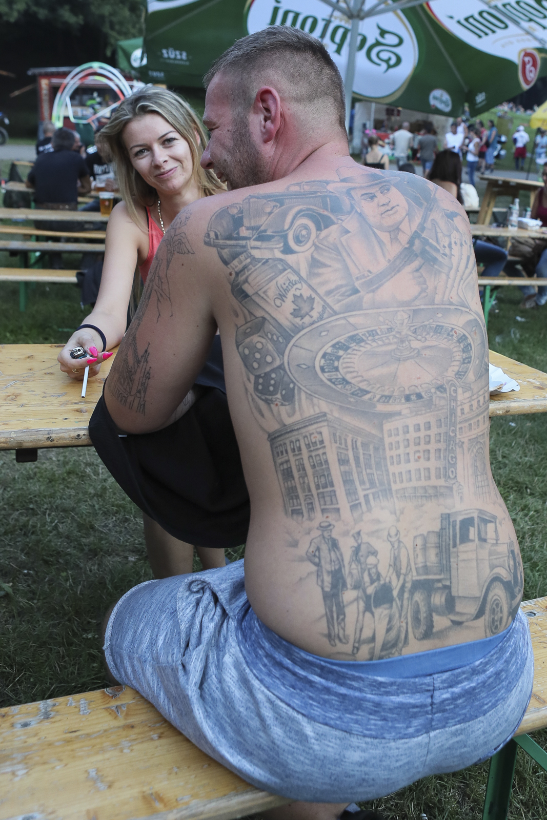 Patrik hátát is jó ideig lehet fürkészni. Mint látni, a régi szép idők, a szeszcsempészet a kedvenc időszaka. A hátára a legbüszkébb, és azt is elárulta nekünk, hogy a következő motívum egy pap lesz lent a pokolban, de az angyalokat sem hagyja ki a repertoárból. Elárulta nekünk is, hogy a színes tetkókat kifejezetten nem szereti.