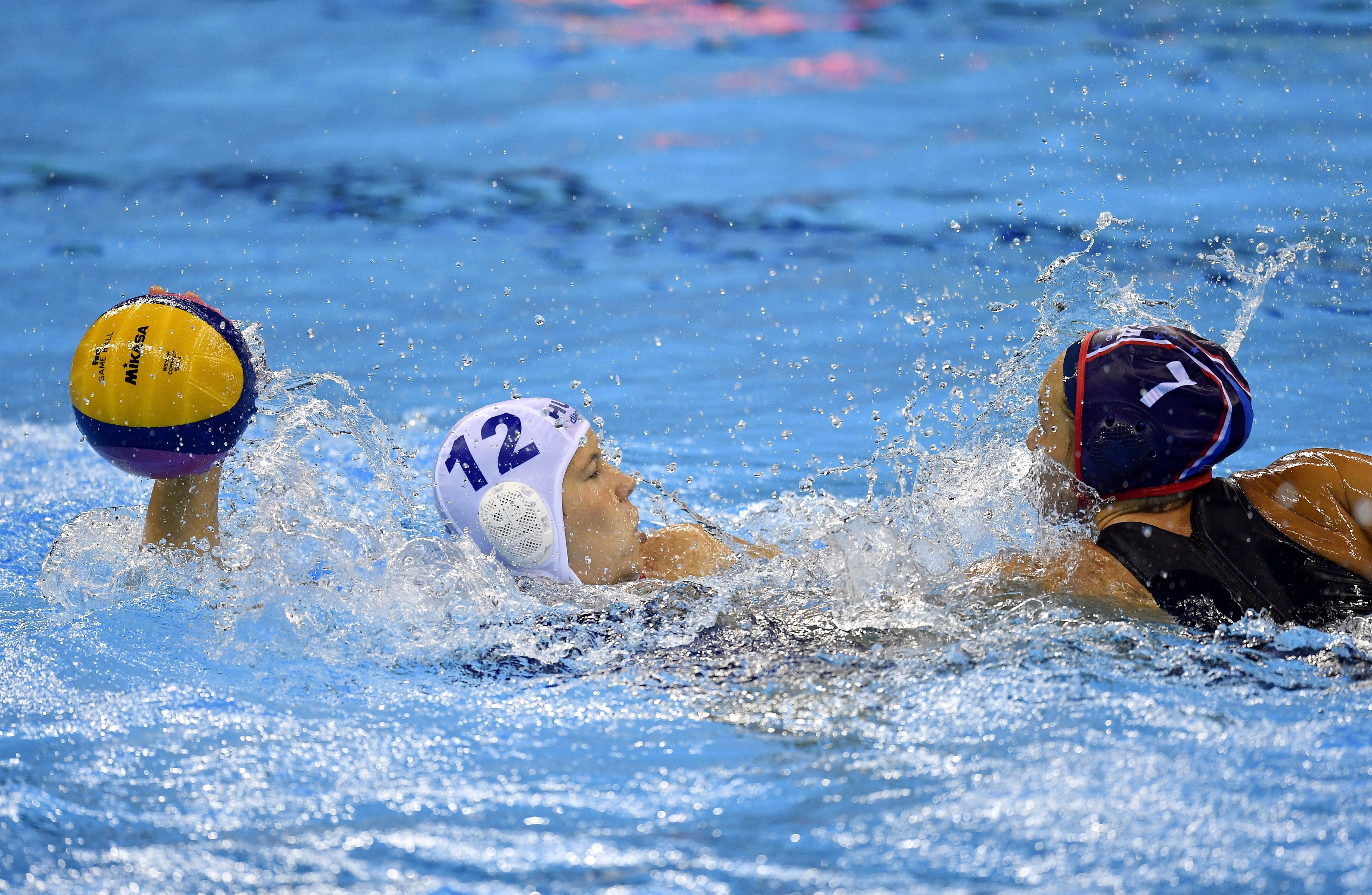 Garda Krisztina (fehérben) és az amerikai Courtney Mathewson a Rio de Janeiró-i nyári olimpia nõi vízilabdatornájának elõdöntõjében (MTI Fotó: Illyés Tibor)