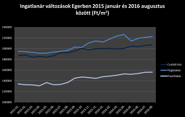 2015 január és 2016 január között az Egerben eladó lakások átlagos Ft/m2 árai 9-10%-kal drágultak, a családi házak szegmensében a négyzetméterenkénti árak ehhez képest kisebb mértékű – 7%-os- volt a változás. Idén országos szinten egy lényegesen mérsékeltebb -5-6%-os – emelkedés mutatkozott, amely az egri lakáspiacon is érvényesült. A családi házak átlagos Ft/m2 árai 3,5%-kal, a tégla-és panellakásoké 4,8-5,8%-kal emelkedtek az év első nyolc hónapjában.