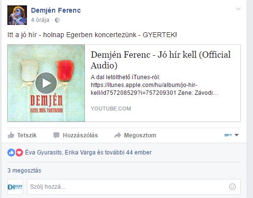 Maga Demjén Ferenc is alig várja már, hogy eljöjjön a péntek, hiszen ma délelőtt Facebook oldalán tette közzé a jó hírt, a Jó hír kell című számával együtt: