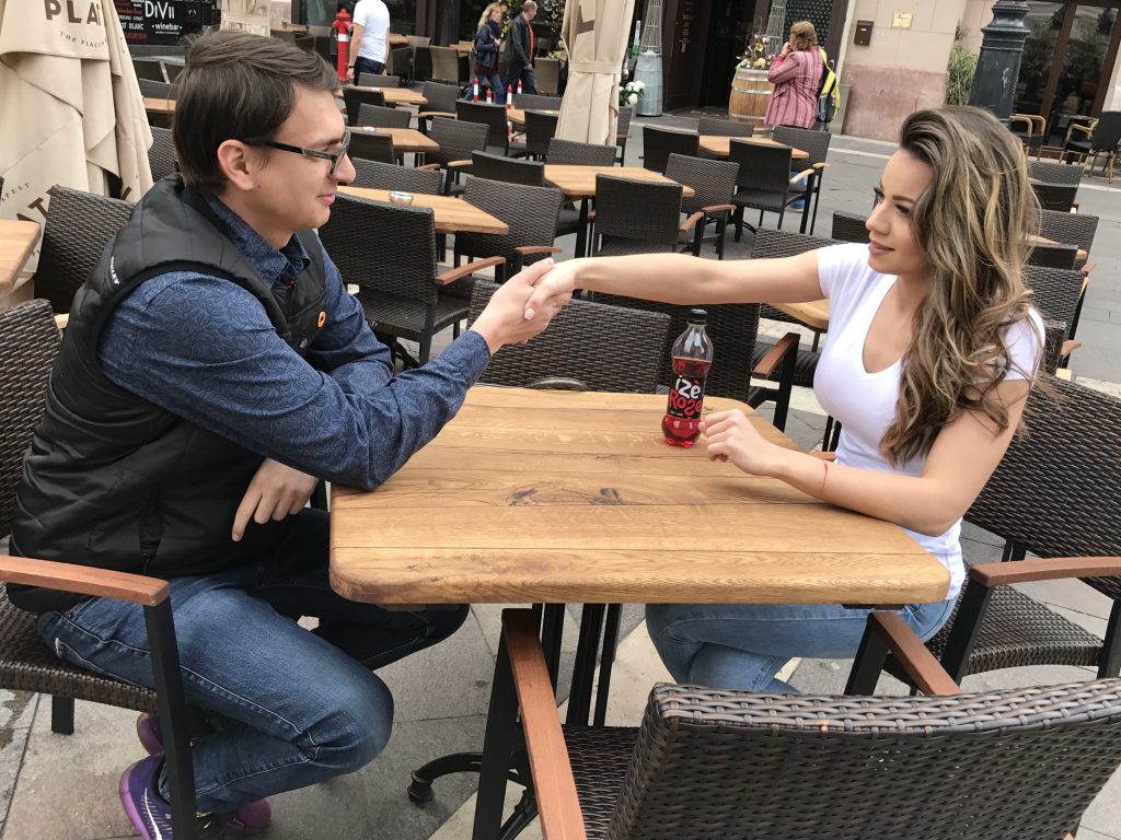 A nagy folyó pesti oldalán készülnek utolsó képeink: csak ajkak, szívószál és üdítő. Hosszan bajlódunk, de végre sikerült. Elkészültünk.