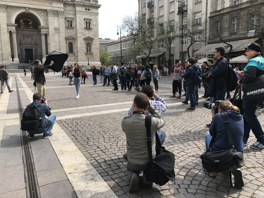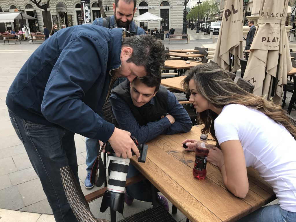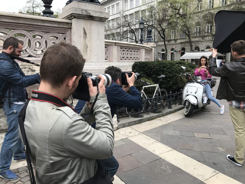 Először a Bazilika lépcsőjén kezdünk dolgozni, de az egymás után érkező bámészkodó és mindent fényképező külföldi csoportok miatt helyszínt váltunk és egy fehér robogó felé vesszük az irányt. A kiszemelt jármű a Platz nevű hely üzletvezetőjéé és ott parkolt a Szent István téren. Elkezdjük a munkát gépcsodánál, mire hirtelen vagy 50 japán bámészkodó izgul csendben fotósunk mögött, hogy jók legyenek a képek.