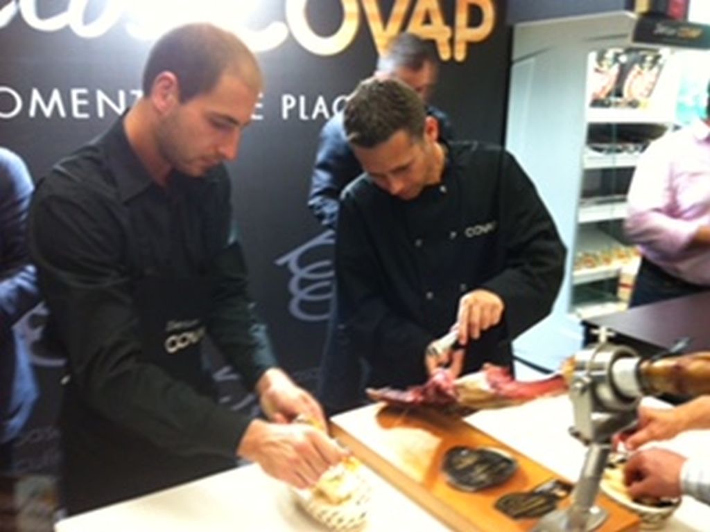 A másik helyi nagyágyú a Covap, amely a híres Ibériai sonkát (kolbászt, szalámit) mutatja be évről évre a fesztiválon. A biotermelést preferáló módszer lényege, hogy a disznók az erdőkben makkot, valamit az anyaföld által kínált csemegéket eszik. Mint ahogy mi is tudjuk, éhes disznó makkal álmodik… Ettől a hús íze különleges lesz. Persze, ez nem elég, 2, 3 vagy éppen 4 évig is érlelik a sonkát a (akár a sós tengeri szélben),  így aztán  ez a finomság nem olcsó, de inkább csemegeként fogyasztják: éles késekkel hártyavékony kis szeleteket vágnak le mesteri módon a szakemberek.
