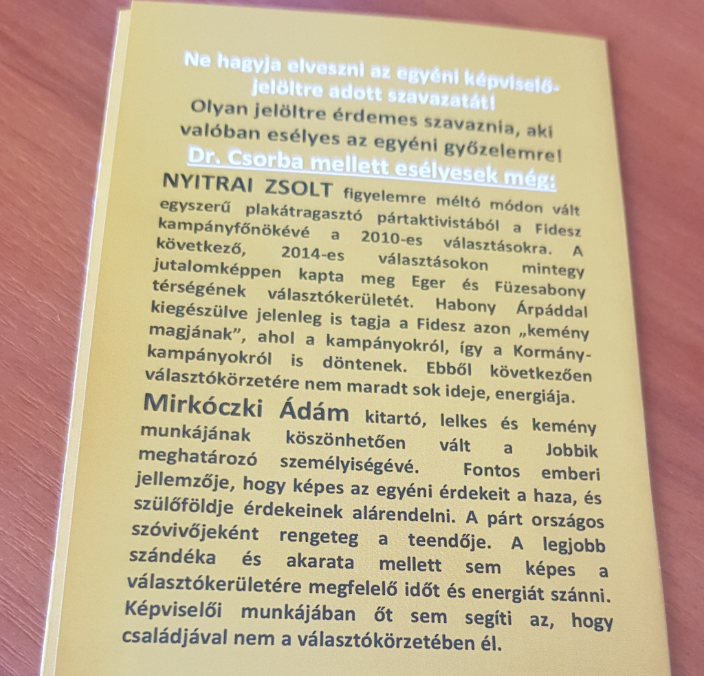 Végképp kellemetlen helyzetbe hozza a fertálymestereket az, hogy Csorba nyíltan a jobbikos Mirkóczkinak udvarol szórólapján.