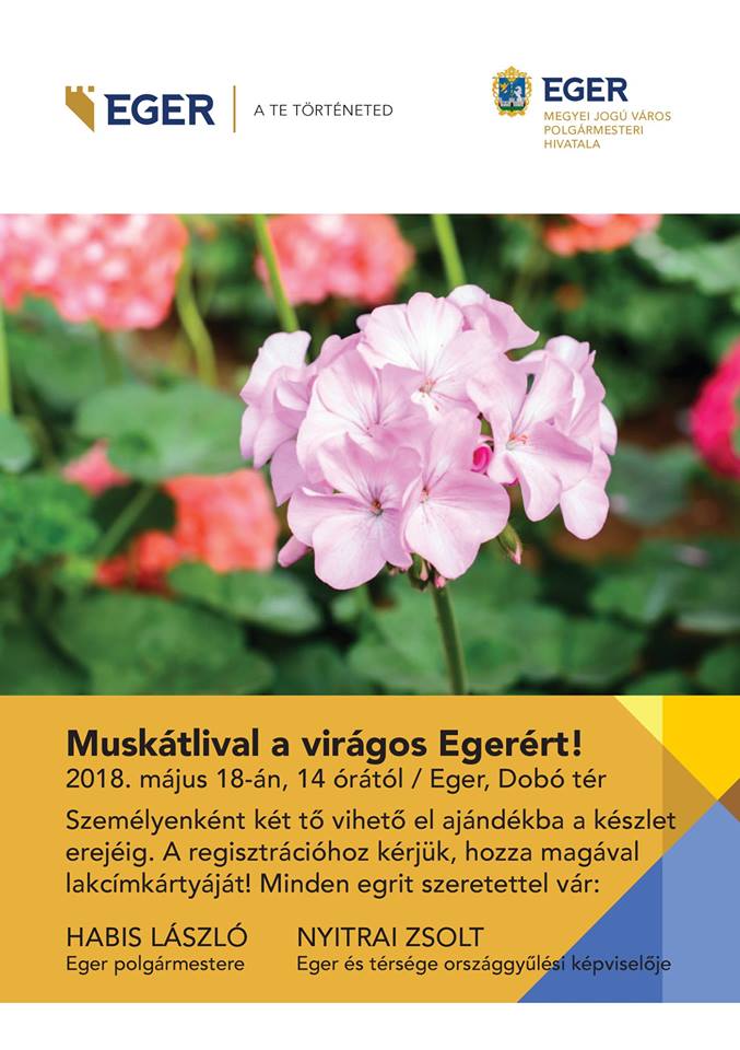 Május 18-án ajándék muskátlit vehetnek át az egri lakosok a Dobó téren. Minden egrit szeretettel vár Habis László polgármester és Nyitrai Zsolt országgyűlési képviselő.