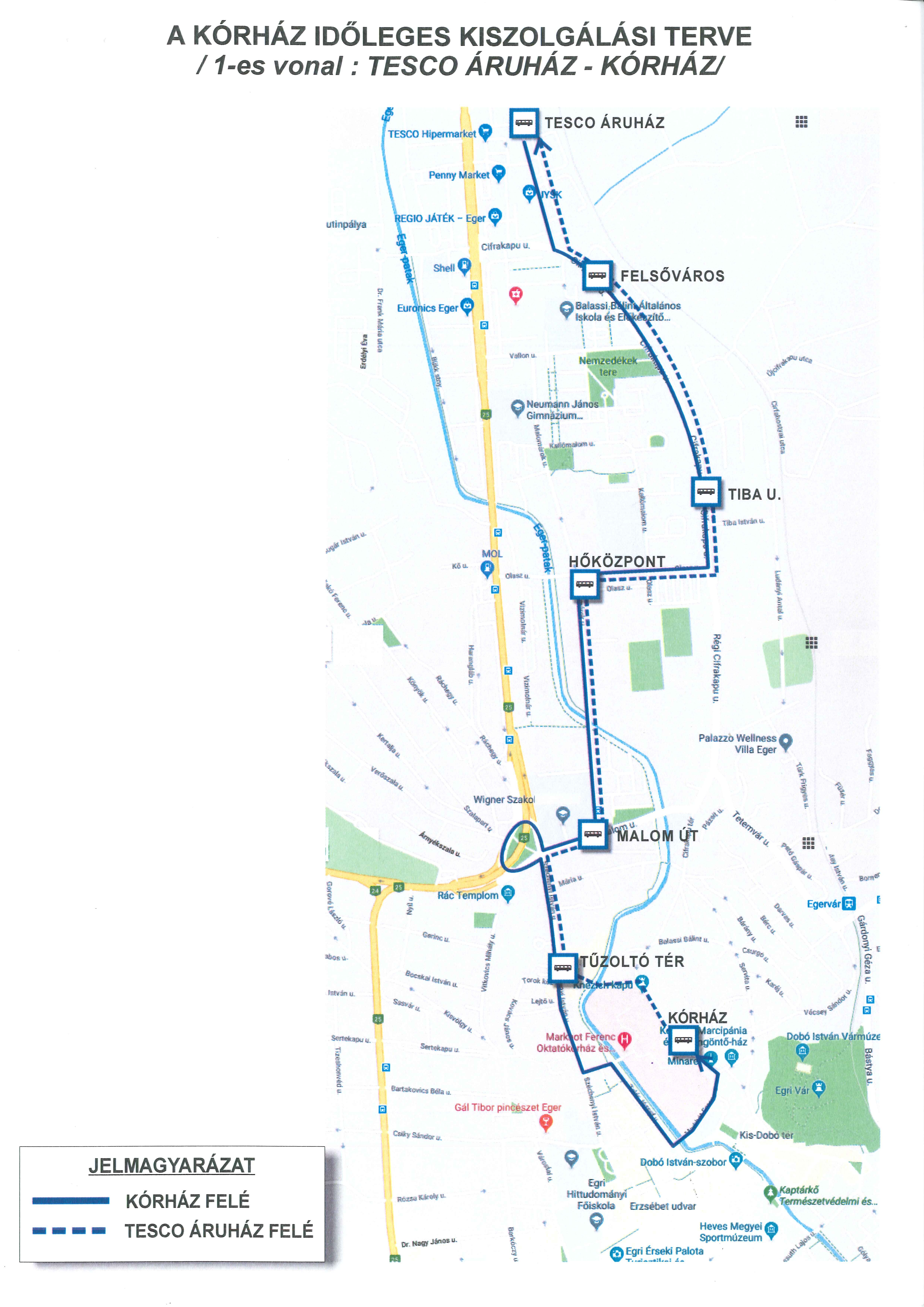 A járatok hétköznap 8 és 11 óra között, a rendelőintézet csúcsidőszakához igazodva közlekednek hétfőtől, a Tesco áruház – Felsőváros (Cifrakapu u.) – Tiba utca – Hőközpont – Malom út – Tűzoltó tér – Kórház útirányon át és vissza – taglalta a tájékoztatón a KMKK Zrt. vezérigazgatója. Uti Csaba kifejtette: az áruháznál átszállási lehetőség lesz a Felnémet, Berva felől érkezőknek, a Malom utcánál a Lajosváros, Tihaméri malom, Vécsey-völgy, Baktai út felől érkezőknek, a Garzonháznál pedig a Vörösmarty út felől érkezőknek. Az 1-es buszjáratnak hét megállóhelye lesz, az utolsó a Minaretnél, ahol így pár parkolóhely megszűnik. A szolgáltatás a szokásos jegyekkel, bérletekkel vehető igénybe. Itt a térkép a járatról: