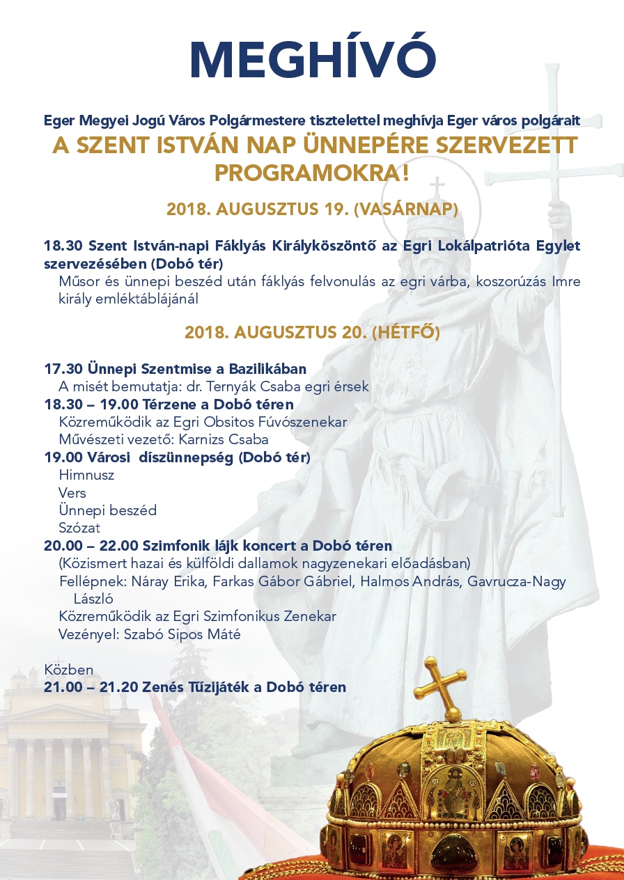 Örömteli és megtisztelő, hogy az Államalapítás Ünnepére elfogadta meghívásunkat Varga Mihály miniszterelnök-helyettes, pénzügyminiszter. Országunk egyik vezetője mondja tehát az ünnepi beszédet a Dobó téri színpadon, aki hivatalos, városi ünnepségen még soha nem járt nálunk. A hagyományokhoz igazodva az ünnepség keretében adjuk át a legrangosabb városi elismeréseket a közismert, köztiszteletben álló helyi személyiségeknek, kiváló és elkötelezett szakembereknek, akik sokat tettek és tesznek városunkért és az egriekért.