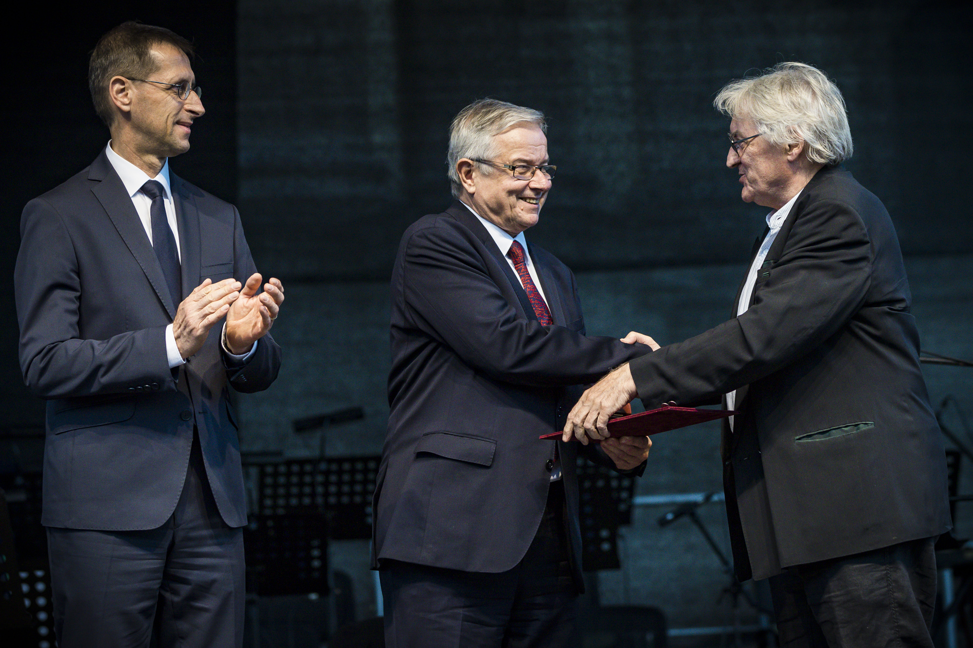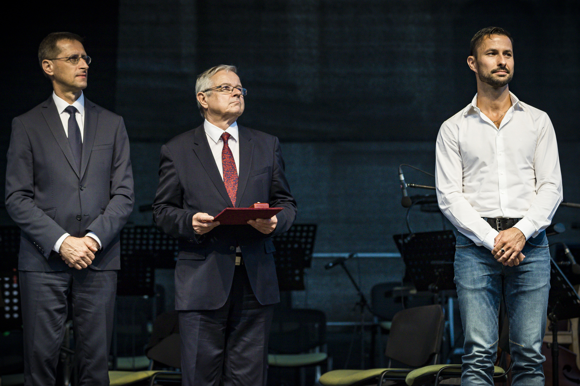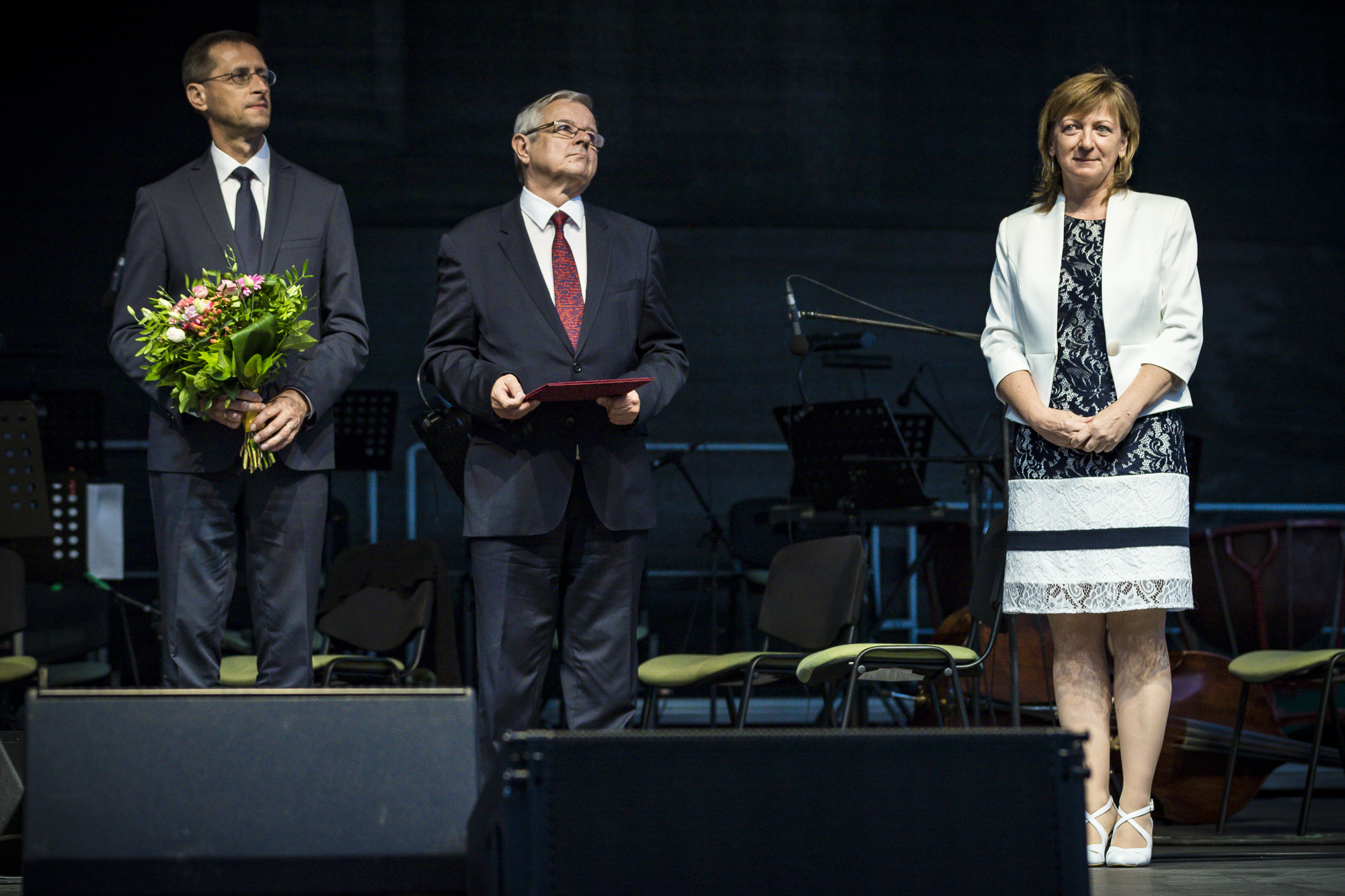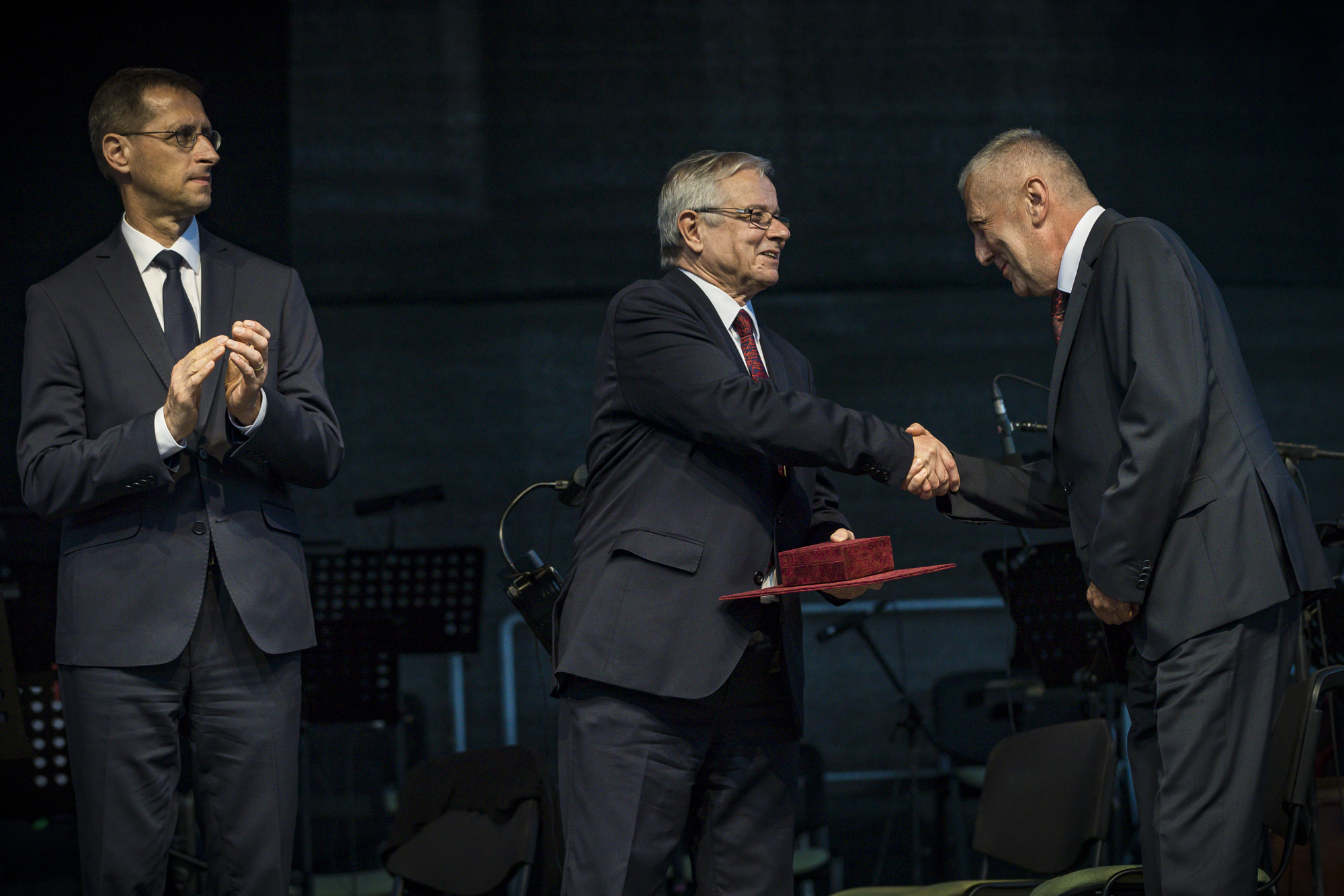 Koltai Lajos átveszi az Eger Díszpolgára kitüntetést Habis László polgármestertől, Varga Mihály pénzügyminiszter társaságában. Fotó: Nemes Róbert