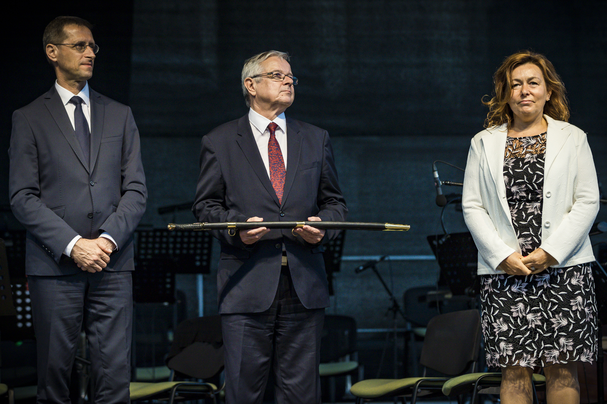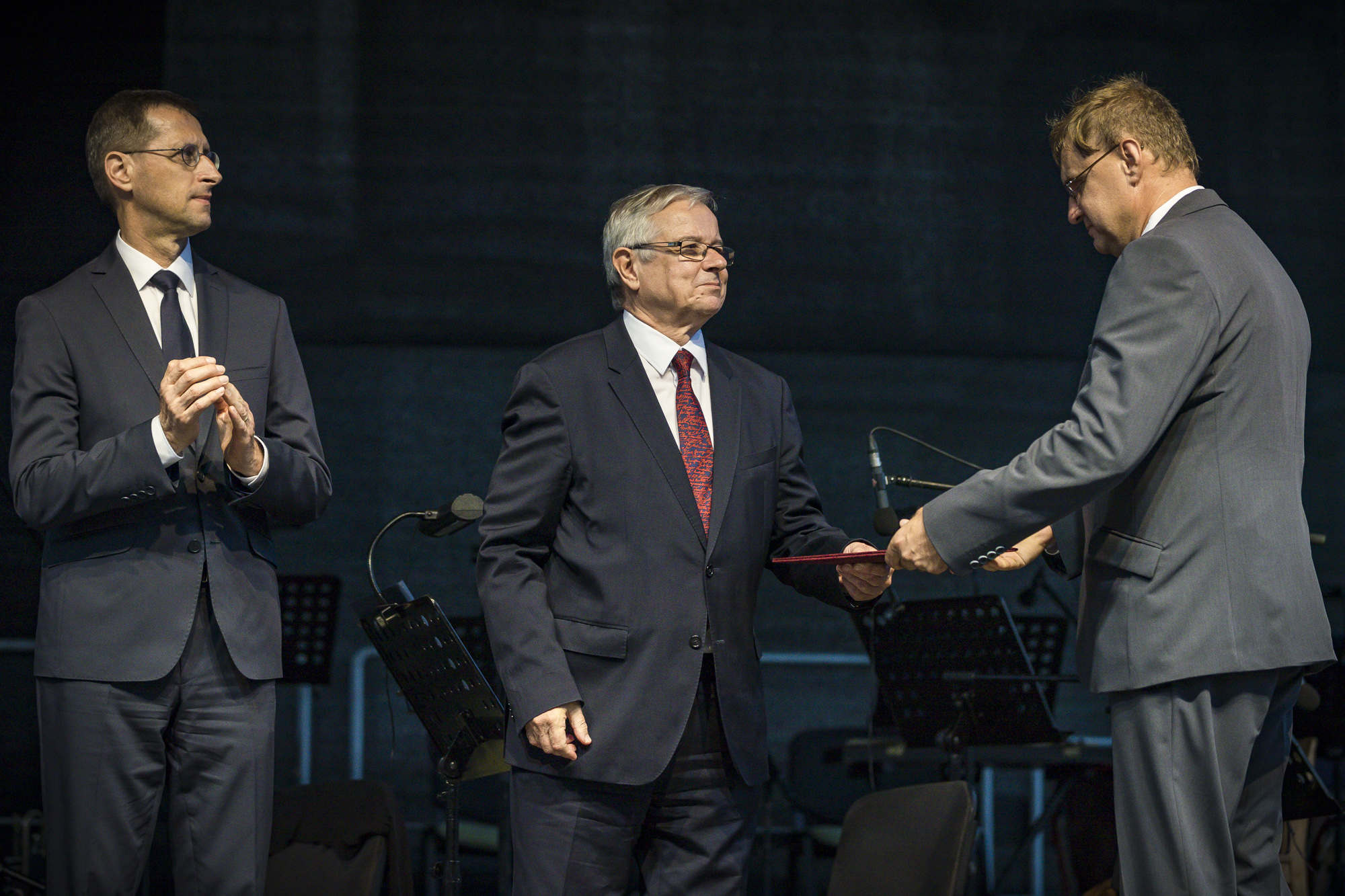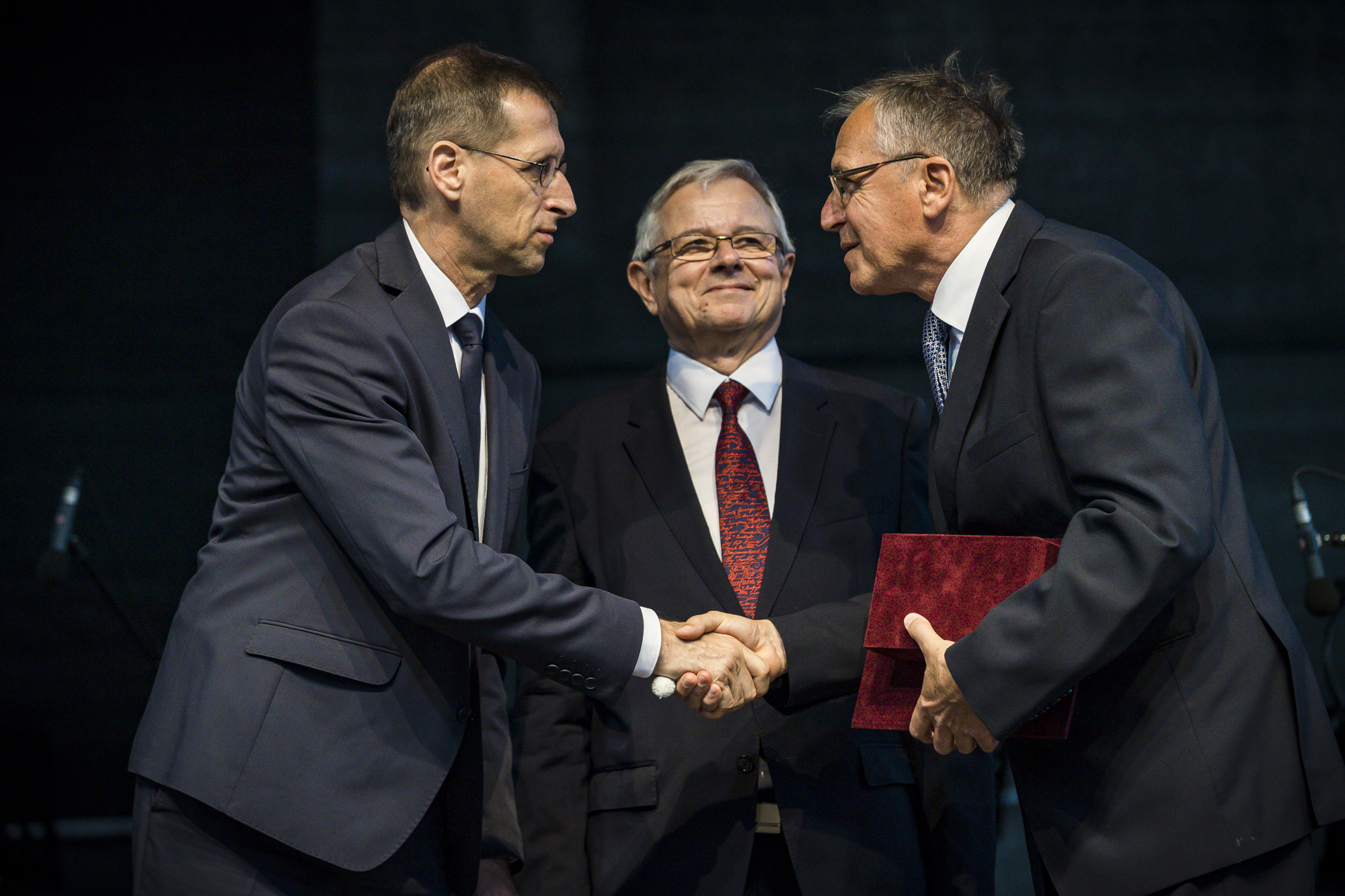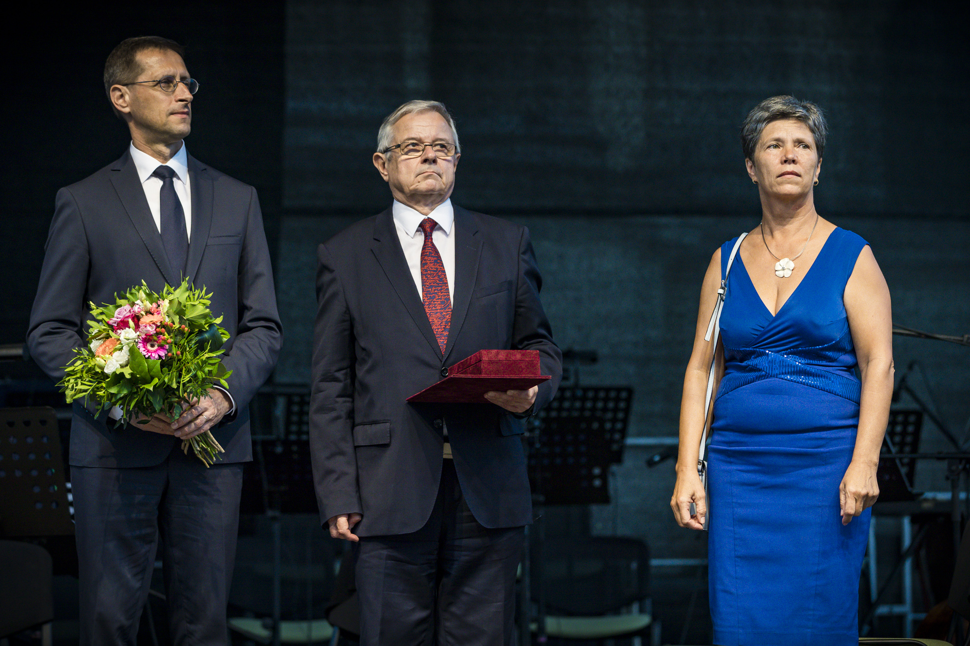 Koltai Lajos átveszi az Eger Díszpolgára kitüntetést Habis László polgármestertől, Varga Mihály pénzügyminiszter társaságában. Fotó: Nemes Róbert