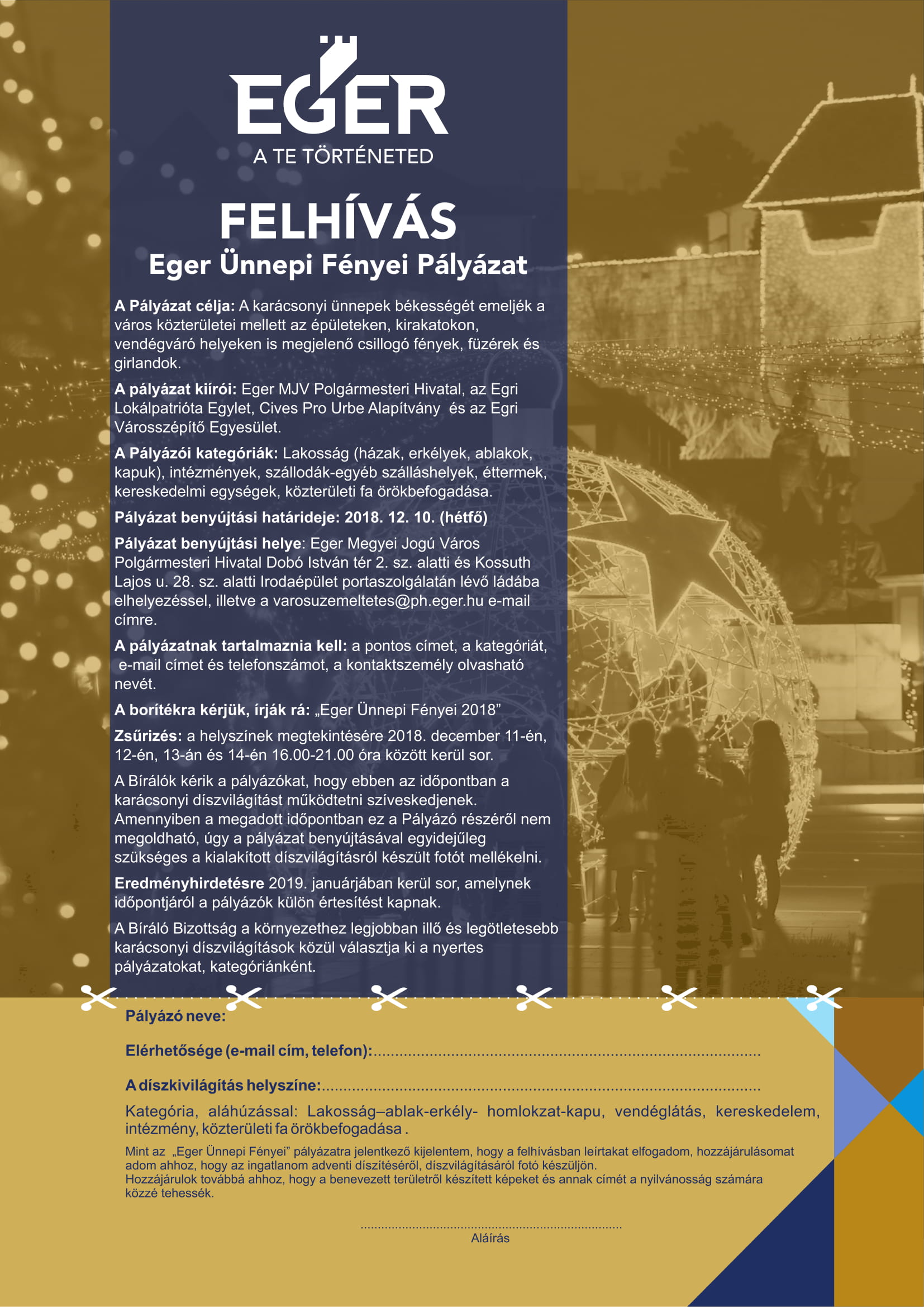 Az Adventi időszak varázslatos városi hangulatának megtartása és gazdagítása céljából az önkormányzat az Egri Lokálpatrióta Egylettel, a Cives Pro Urbe Alapítvánnyal és az Egri Városszépítő Egyesülettel közösen az idén is meghirdeti az Eger Ünnepi Fényei pályázatot.