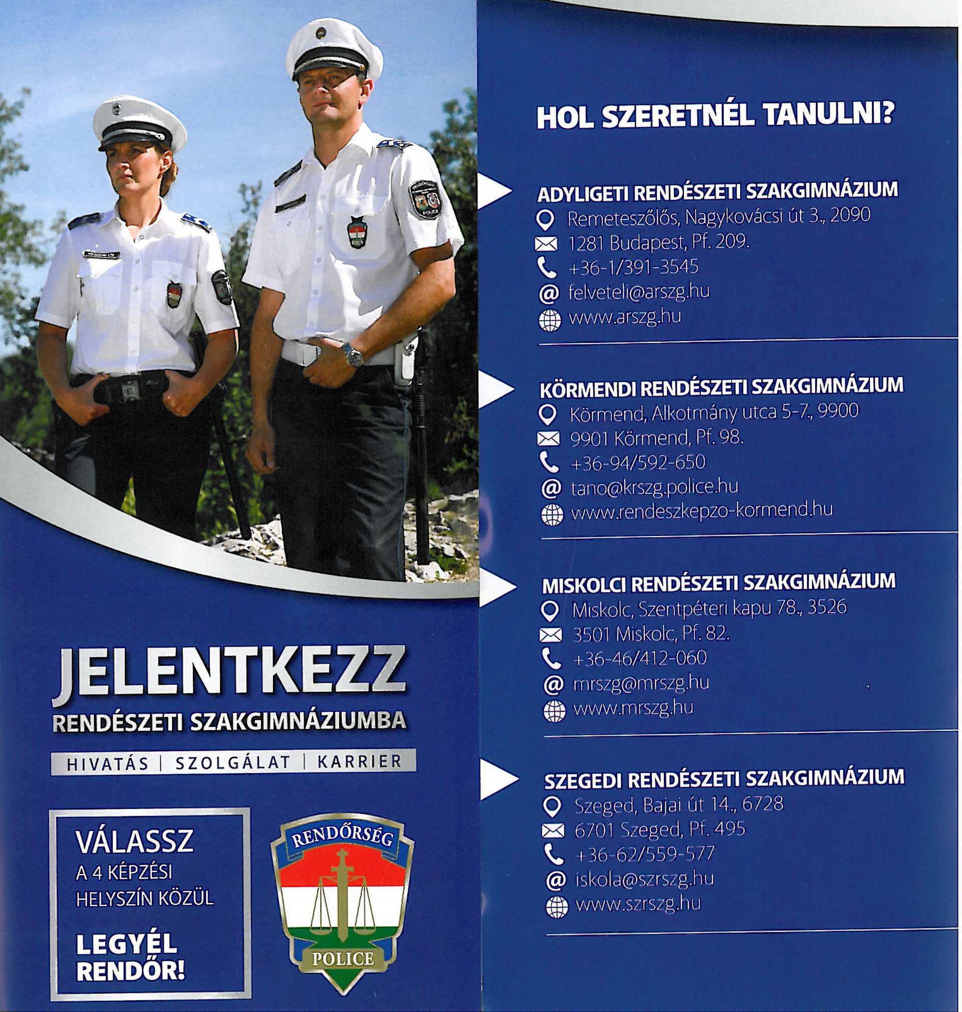 A Gyöngyösi Rendőrkapitányság toborzó napot tart 2019. január 16-án, szerdán 9 órától a kapitányság épületében. A rendezvényre olyan végzős középiskolásokat és érdeklődőket várnak, akik elhivatottnak érzik magukat a rendőri pálya iránt.