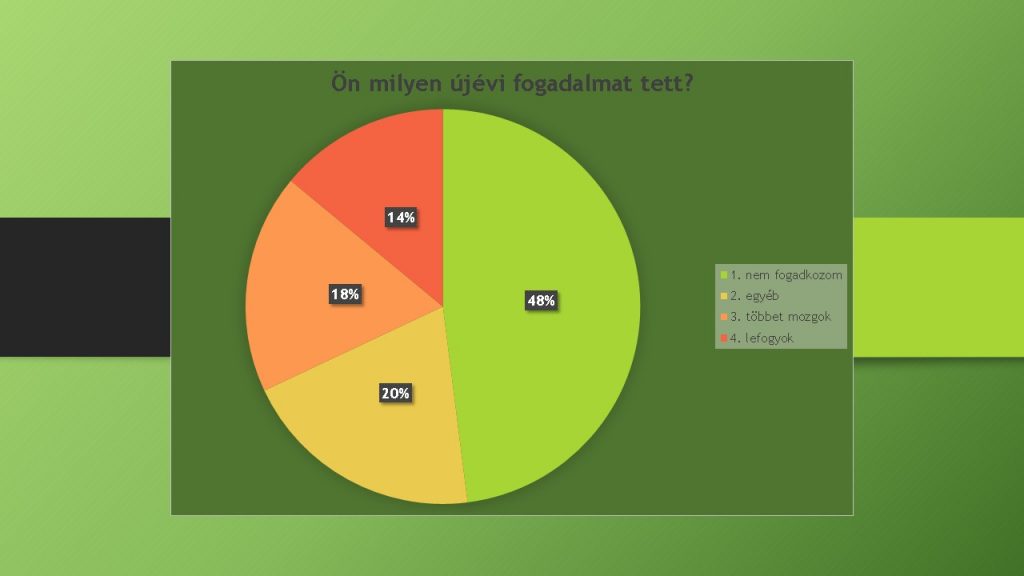 Szilveszter éjjelén többen teszik a szívükre a kezüket és tesznek fogadalmat arról, hogy az új esztendőben mint csinálnak majd másként. Rendkívül népszerű „letenni a nagy esküt” arra, hogy valaki többet mozog majd mint eddig vagy éppen fogyókúrába kezd. Nos, olvasóink körében megdőlt ez a tévhit, mert többségük egyáltalán nem fogadkozik. Lássuk az eredményeket!