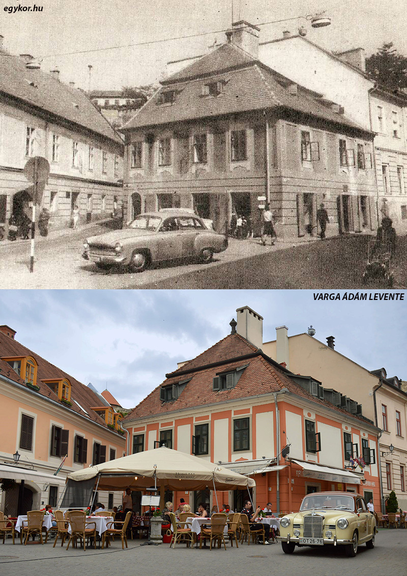 Utcakép a Senator házzal a Kis-Dobó tér felől nézve. A két kép között nagyjából fél évszázad telt el. A régi képen egy „Púpos” Wartburg (Wartburg 312), az új képen egy gyönyörű állapotú Ponton Mercedes látható. Külön érdekesség, hogy az új képen a Mercedes régebbi gyártású, mint a régi képen a Wartburg. A Mercedes egyébként a X. Mercedes-Benz Classic Csillagtúra alkalmával járt Egerben 2017 májusában.