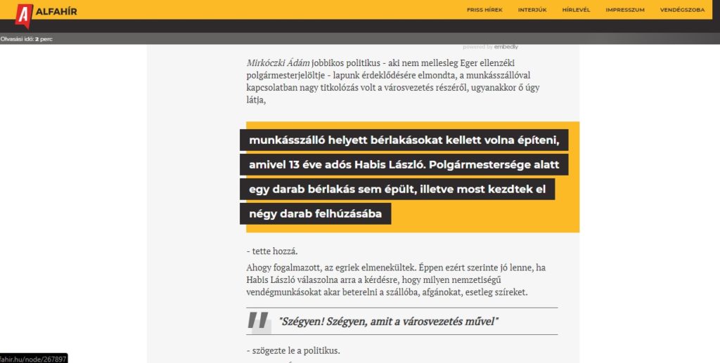 “…az egriek elmenekültek. Éppen ezért jó lenne, ha Habis László válaszolna arra a kérdésre, hogy milyen nemzetiségű vendégmunkásokat akar beterelni a szállóba, afgánokat, esetleg szíreket. Szégyen! Szégyen, amit a városvezetés művel!”