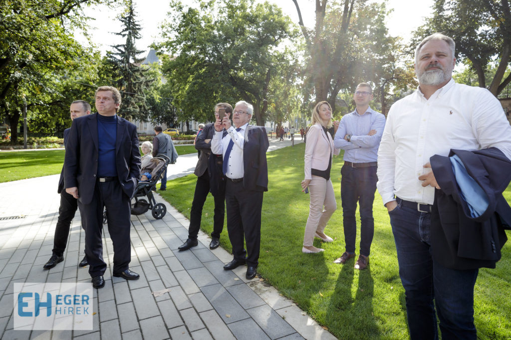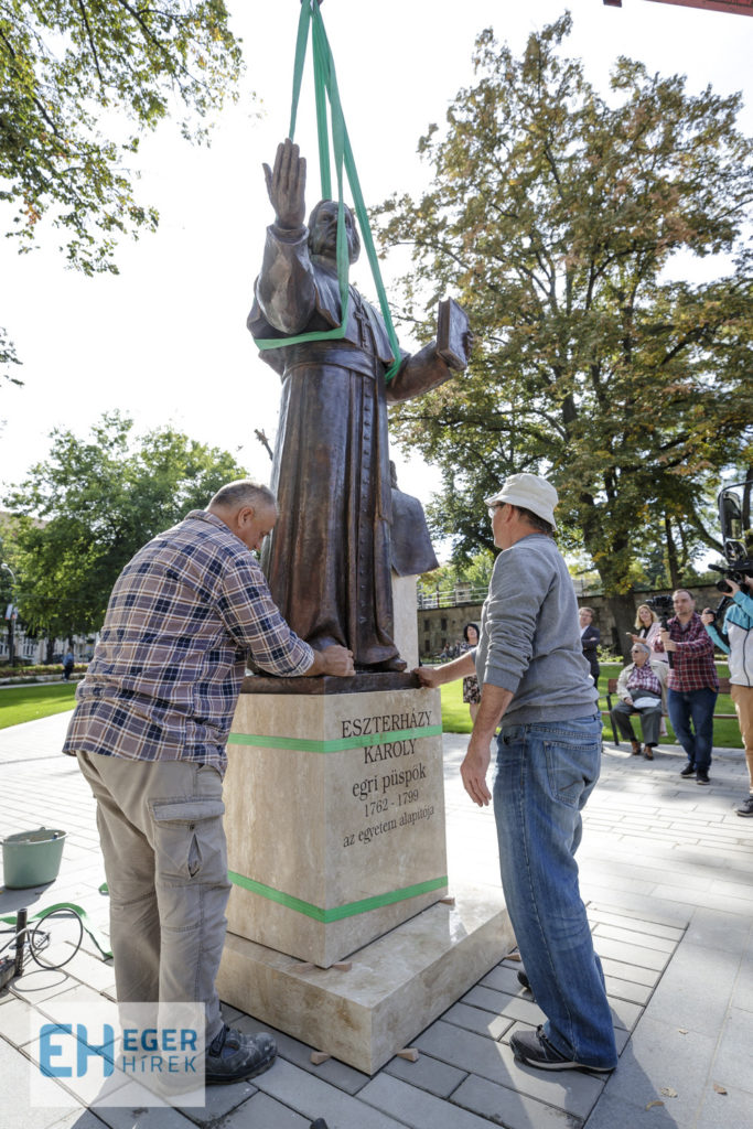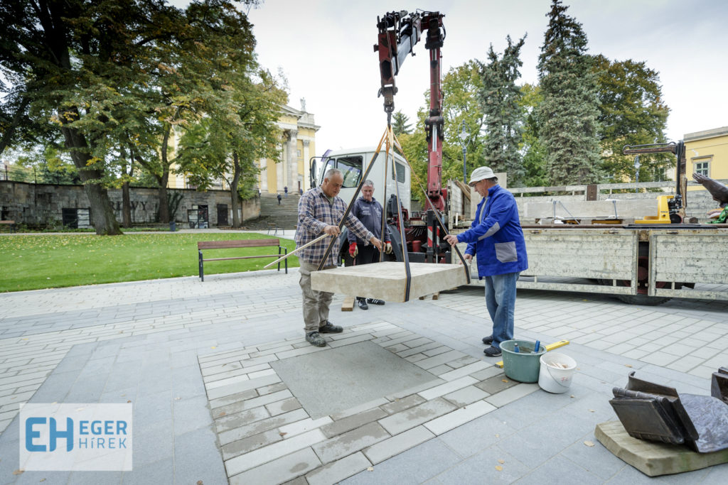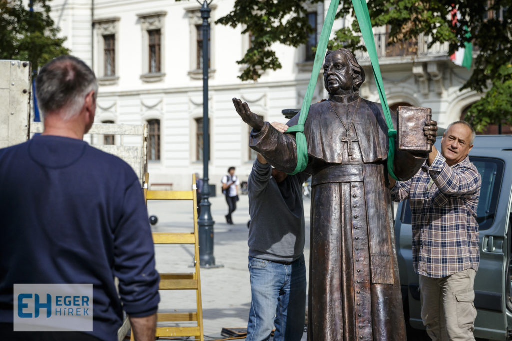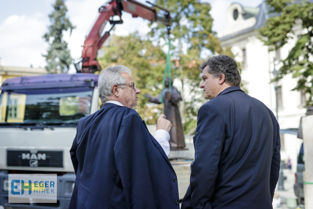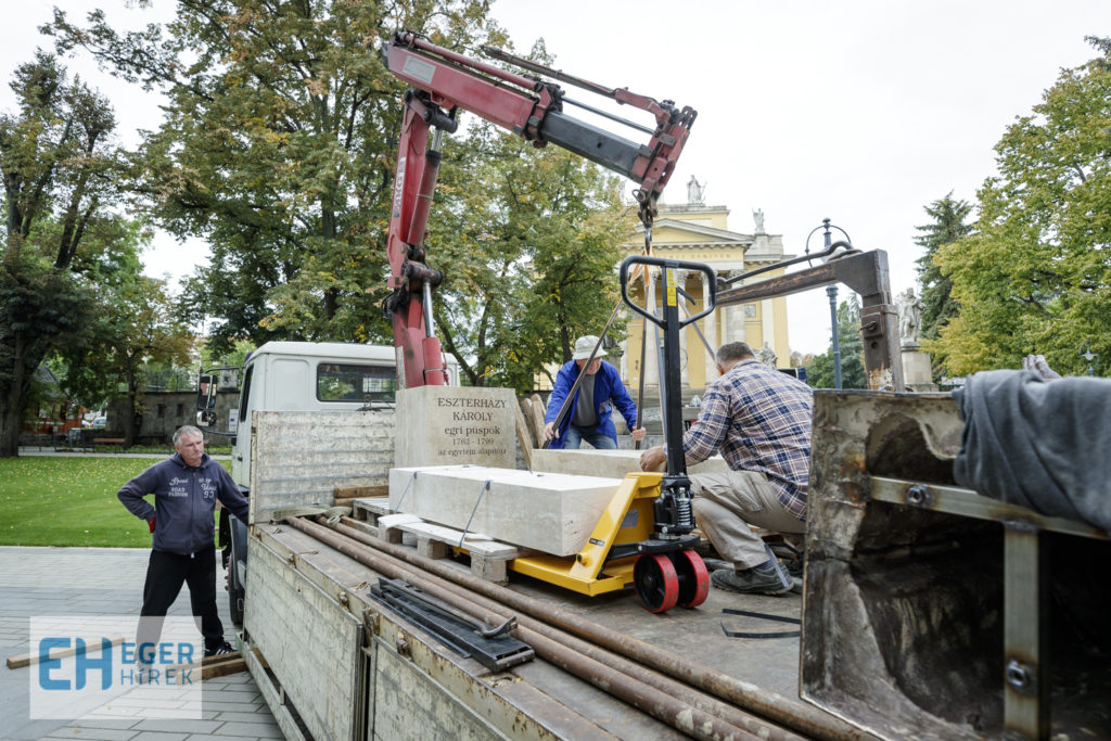 Vasárnap délután ünnepélyes keretek között adják át a megújult Eszterházy teret, melynek éke, az Eszterházy püspök-szobor, csütörtök délben érkezett meg méltó helyére. (Nemes Róbert fotói)