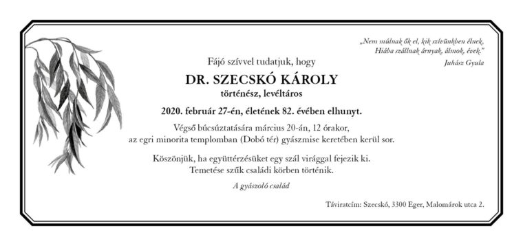 2020. február 27-én, életének 82. évében elhunyt dr. Szecskó Károly. A Gárdonyi Géza díjas történész, levéltáros végső búcsúztatására március 20-án 12 órakor, az egri minorita templomban tartanak gyászmisét. Temetésére szűk családi körben kerül sor.
