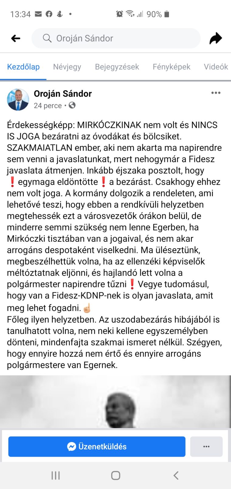Amellett, hogy nem ismeri a határidőket, sorozatban hoz szakmaiatlan és jogszerűtlen döntéseket egyszemélyben Mirkóczki Ádám- véli Oroján Sándor. A Fidesz-KDNP egri frakciójának vezetője szerint ugyanis a polgármester óvoda és iskolabezárásról szóló határozata jelen helyzetben- értsd a kormány által kihirdetett veszélyhelyzetben- minden jogalapot nélkülözhet. A visszásságra Oroján Sándora közösségi oldalán is felhívta a figyelmet. Hozzáteszi azt is: ha Mirkóczki a szombati rendkívüli közgyűlésen meghallgatta volna a kormánypárti képviselőket, akkor nem futott volna bele ismét egy ilyen helyzetbe. A Fidesz-KDNP frakció javaslata szerint ugyanis a bezárással egyrészt megvárták volna a kormányrendeletet, másrészről időt adtak volna mind az intézményeknek, mind a szülőknek felkészülni a helyzetre azzal, hogy egy esetleges bezárás csak négy nap múlva, szerdán lépjen életbe. Íme a poszt: