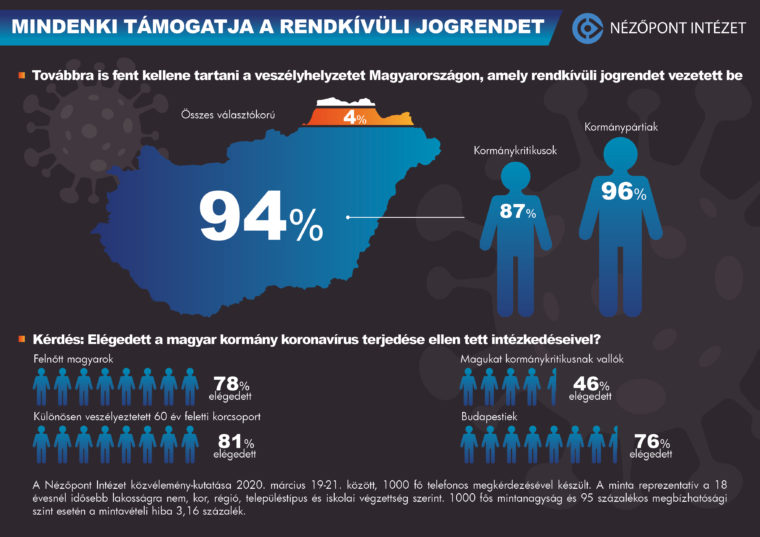 Példa nélküli nemzeti egység alakult ki a koronavírus elleni védekezés ügyében Magyarországon. Hétfőn tárgyalja az Országgyűlés a veszélyhelyzet és ezzel a rendkívüli jogrend meghosszabbítását. A döntéshozó képviselőknek is fontos tudnia, hogy a magyarok 94 százaléka szerint „továbbra is fent kellene tartani a veszélyhelyzetet Magyarországon, amely rendkívüli jogrendet vezetett be” (csak 4 százalék ellenezte).