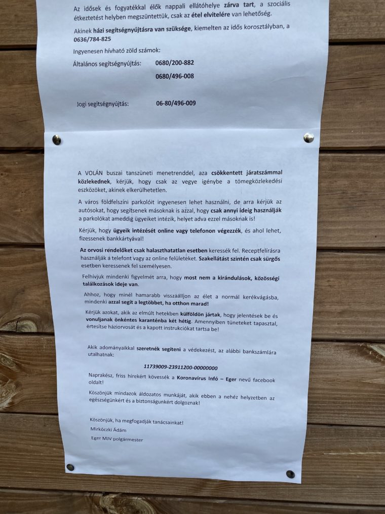 Az olvasónk által beküldött fotó az egyik önkormányzat által felállított fertőtlenítő-és tájékoztató pont oldalán kihelyezett irományról készült. A dokumentum-ha lehet így nevezni- összefoglalja egy részét azoknak az információknak, amelyek a koronavírus elleni védekezés kapcsán érdekesek lehetnek az egrieknek. Mivel aláírásként is Mirkóczki Ádám polgármester neve szerepel, ezért maximálisan azt az érzetet kelti, hogy az abban leírt információk szegről-végről az önkormányzathoz köthetők.