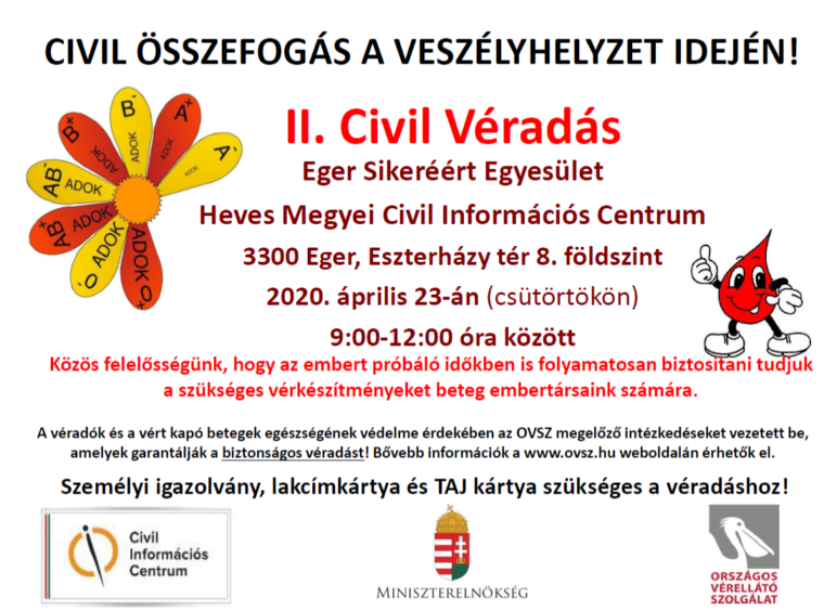 A rendszeres véradók és az először segítők figyelmét egyaránt szeretnénk felhívni egy újabb lehetőségre. Ezúttal az Eger Sikeréért Egyesület és a Heves Megyei Civil Információs Centrum szervez véradást az Eszterházy tér 8-ban, ahová várnak mindenkit, aki így is szeretne segíteni embertársainak.