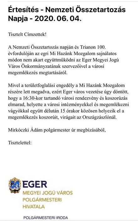 Már egy megemlékezés sem megy simán, békésen. Alig egy órával ezelőtt ugyanis értesítette az érintetteket a Polgármesteri Hivatal illetékese arról, hogy a ma 16:30-ra tervezett, a Nemzeti Összetartozás Napjára és Trianon 100. évfordulójára meghirdetett rendezvény és koszorúzás elmarad, mert a város vezetése nem tudott megállapodni a Mi Hazánk Mozgalommal. Mivel a területfoglalási engedély a Mi Hazánk Mozgalom nevére szól, ezért Mirkóczkiék kénytelenek voltak lefújni a városi rendezvényt. Íme a levél: