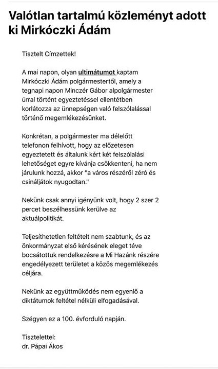 Nem sokkal később dr. Pápai L. Ákos szintén közleményt adott ki, amelyben az áll: Mirkóczkiék közleménye valótlan tartalmú és a Mi Hazánk Mozgalom ultimátumot kapott a polgármestertől. Íme a történet a másik szemszögből nézve: