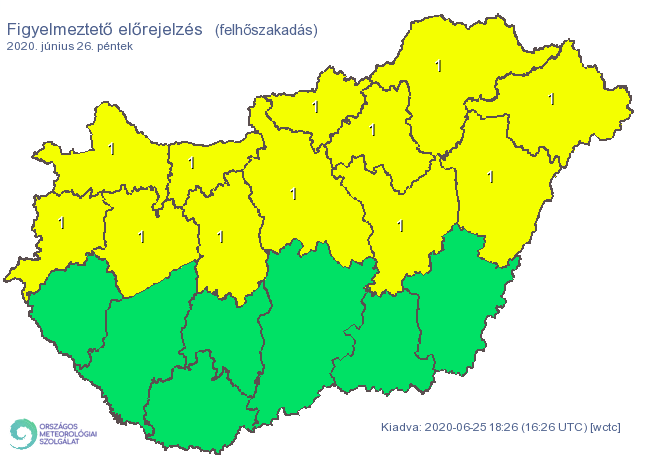 Emellett Budapestre, Pest, Borsod-Abaúj-Zemplén, Fejér, Győr-Moson-Sopron, Hajdú-Bihar, Heves, Jász-Nagykun-Szolnok, Komárom-Esztergom, Nógrád, Szabolcs-Szatmár-Bereg, Vas és Veszprém megyére a felhőszakadás veszélye miatt is elsőfokú figyelmeztetést adtak ki.