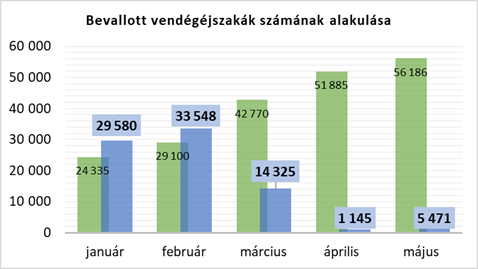 A Nemzeti Turisztikai Adatszolgáltató Központ a szálláshelyek január-májusi forgalmáról közölt adatokat. Eszerint 2020 májusában a hazai szálláshelyekre összesen 134 ezer vendég érkezett, akik 433 ezer vendégéjszakát töltöttek el. Fontos adat az is, hogy a vendégszám 94%-a, a vendégéjszakák 82% a hazai vendégektől származott.