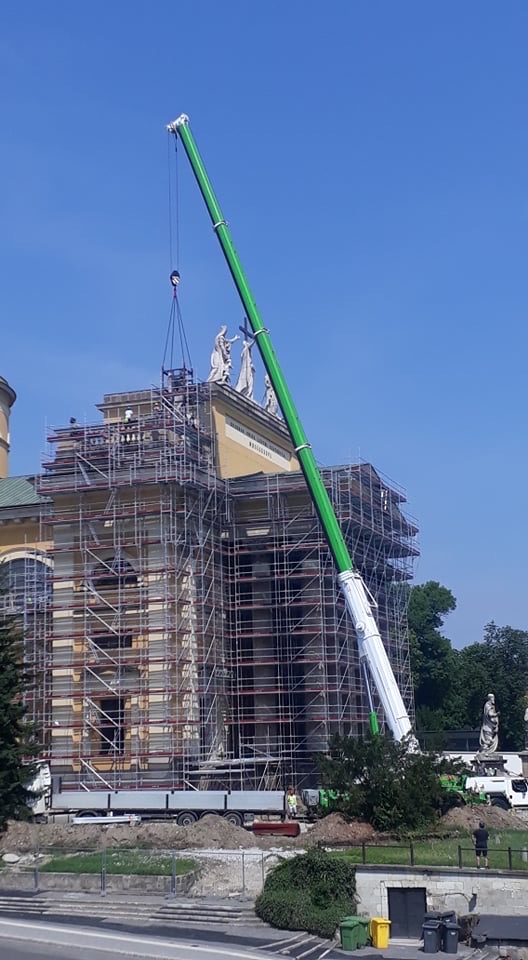 A bazilika felújítása már eddig is bővelkedett látványos megoldásokban, hétfőn viszont megérkezett a Pyrker térre egy daru, mely a székesegyházat díszítő szobrok leemelésében nyújt hathatós segítséget. Marco Casagrande szobrai hamarosan megújulva térnek majd vissza méltó helyükre.