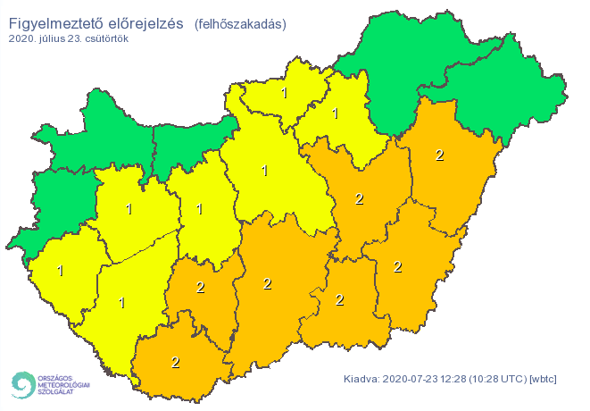 Emellett az egész országban a zivatarveszély miatt is elsőfokú figyelmeztetés van érvényben.