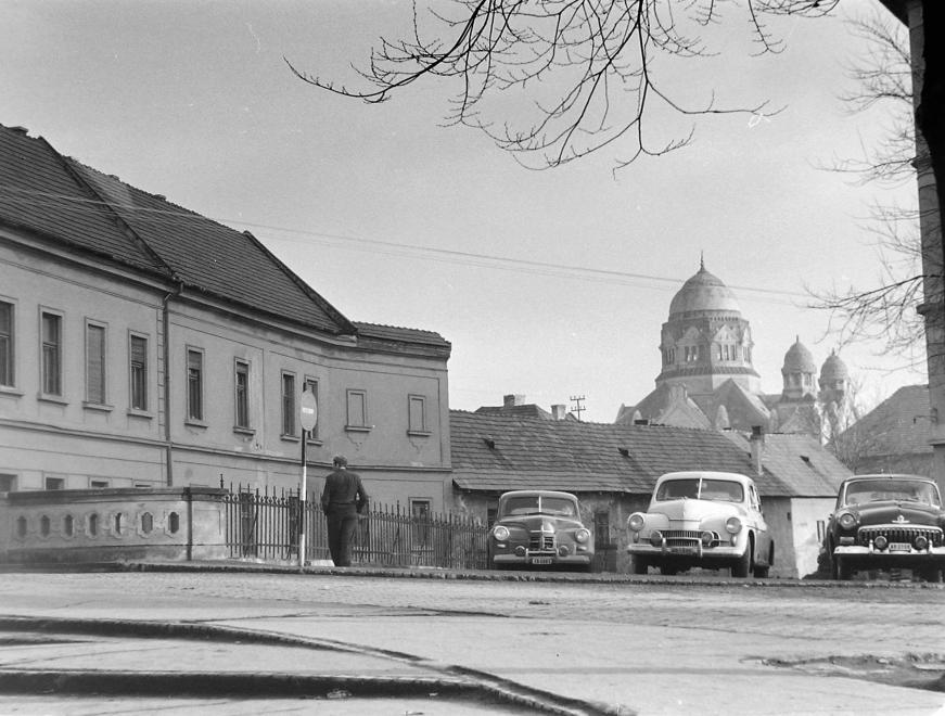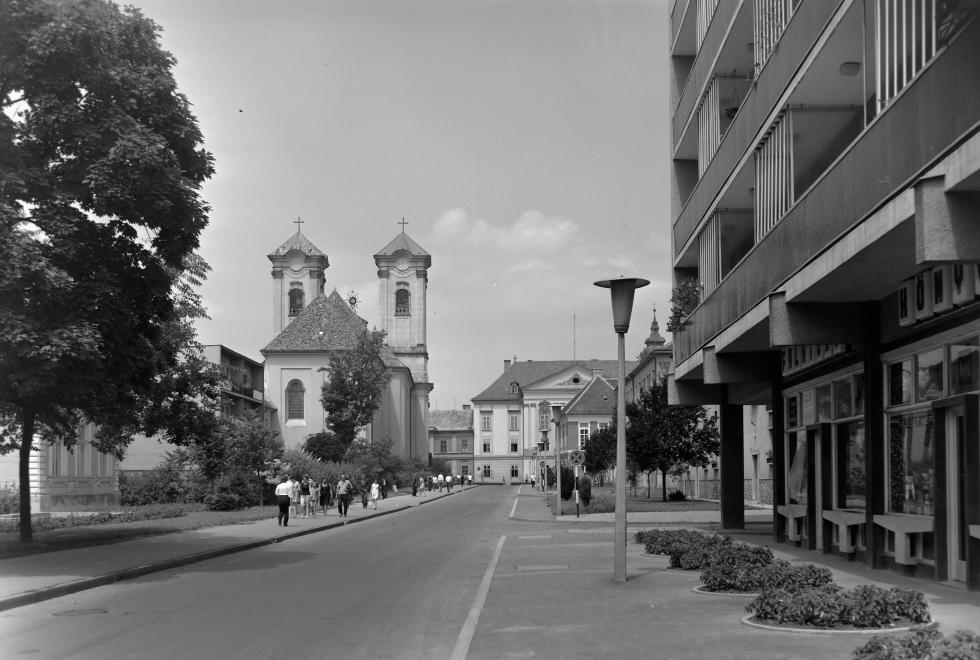 Egészségház utca, szemben a Kossuth Lajos utcánál a Ferences templom és a Megyeháza (ekkor Megyei Tanács). Fortapan, 1967, Inkey Tibor