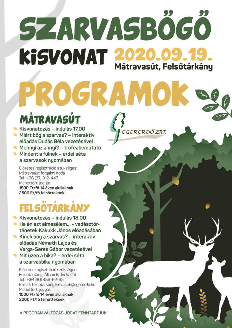 Az Egererdő Zrt. idén is megrendezi a Szarvasbőgő kisvonatozást két helyszínen, a felsőtárkányi Stimecz-háznál és a Mátravasút, Szalajka-ház vonalán.