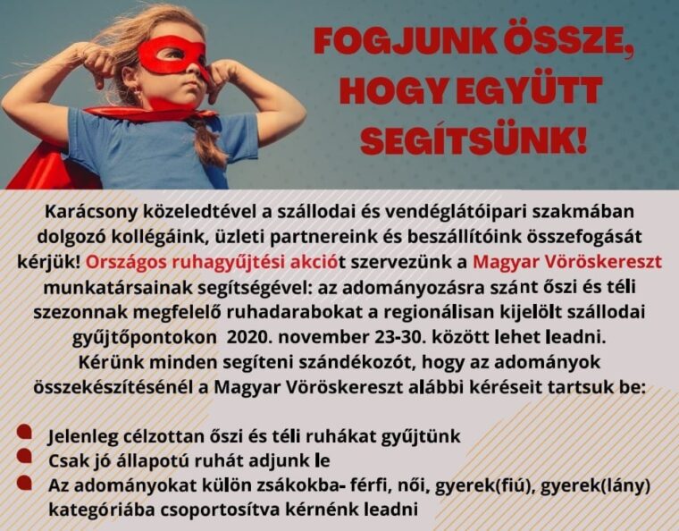 A szálloda szektor idén már másodjára éli át azt a traumát, amit a koronavírus-járvány miatt tavasszal már elszenvedtek egyszer. A Hotel Eger munkatársai amellett, hogy meglehetősen érzékenyen érinti őket a legújabb kormányzati intézkedés, úgy döntöttek, hogy csatlakozva a Magyar Vöröskereszt és a Magyar Szállodák és Éttermek Szövetsége által életre hívott adománygyűjtő akcióhoz, ruhagyűjtő pontként igyekeznek segíteni a rászorulókon.