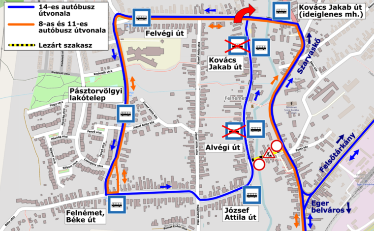 Hozzátették azt is: a Kovács Jakab utcai megálló helyett a Felvégi úton kialakított ideiglenes megállóhelyen lehet felszállni a Béke út irányába. Térképet is mellékeltek a könnyebb eligazodásért:
