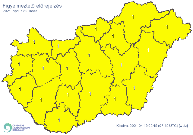 Zivatarveszély miatt az egész országra elsőfokú figyelmeztetést adott ki keddre az Országos Meteorológiai Szolgálat.