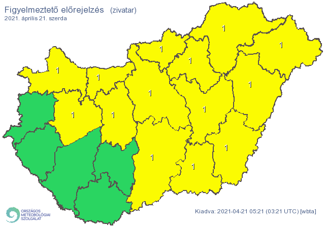 Zivatarveszély miatt citromsárga, vagyis elsőfokú figyelmeztetést adtak ki: