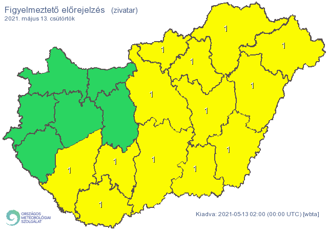 Csütörtökre Budapestre, Pest, Baranya, Bács-Kiskun, Békés, Borsod-Abaúj-Zemplén, Csongrád-Csanád, Hajdú-Bihar, Heves, Jász-Nagykun-Szolnok, Nógrád, Somogy, Szabolcs-Szatmár-Bereg és Tolna megyére adták ki a zivatarveszély miatti elsőfokú figyelmeztetést. Az előrejelzés szerint csütörtök hajnalban 10-15, délután 16-22 Celsius-fok várható.