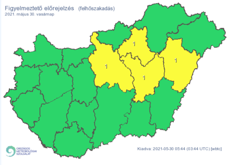Az MTI-hez eljuttatott veszélyjelzésük szerint emellett Budapestre, Pest, Hajdú-Bihar, Heves és Jász-Nagykun-Szolnok megyére a felhőszakadás veszélye miatt is elsőfokú figyelmeztetést adtak ki.