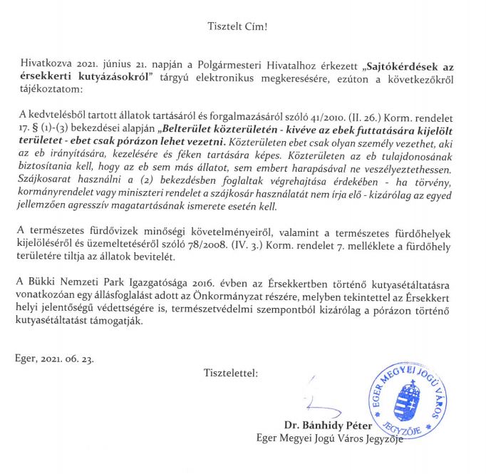 A további kérdéseinket korábban megküldtük dr. Bánhidy Péternek, Eger Megyei Jogú Város jegyzőjének. Az eredeti cikkünk megjelenésekor még nem érkezett válasz, mostanra azonban már igen:
