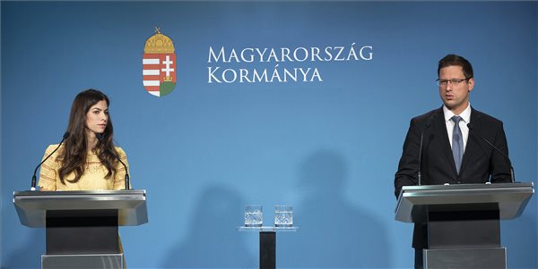 Szentkirályi Alexandra kormányszóvivő (b), és Gulyás Gergely Miniszterelnökséget vezető miniszter (j) egy korábbi kormányinfón