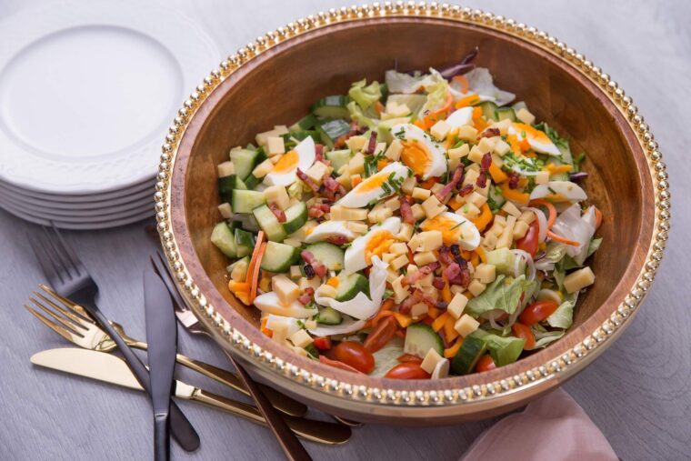 Vágjuk kis kockákra a kígyóuborkát, a kaliforniai paprikát és adjuk hozzá a salátamixhez. Keverjük hozzá a felkockázott sajtot és a félbevágott koktélparadicsomokat is. Főzzük meg a tojást, majd daraboljuk fel. Az öntet hozzávalóit keverjük össze egy kis tálban, majd forgassuk össze a salátával. A sütőben ropogósra sült bacont tördeljük falatnyi darabokra és a tojásgerezdekkel együtt tegyük a salátára.