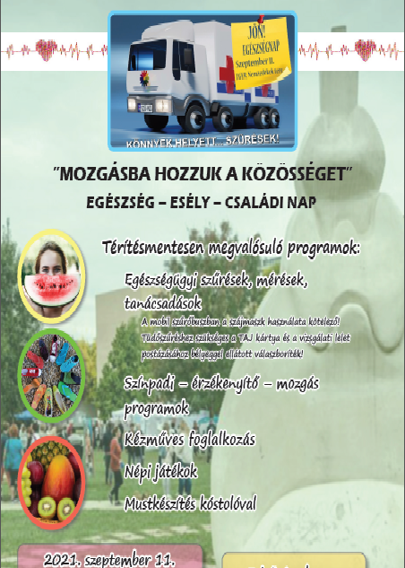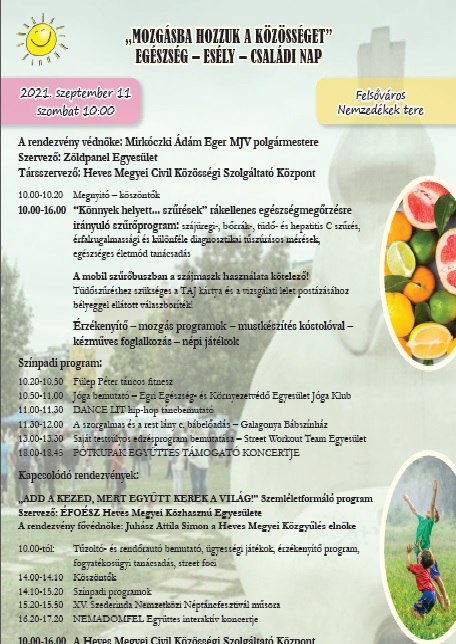 „Mozgásba hozzuk a közösséget” elnevezéssel Egészség – Esély – Családi Napot szervez szombatra a Zöldpanel Egyesület a Nemzedékek terére 10 órától. A rendezvény ingyenesen látogatható.