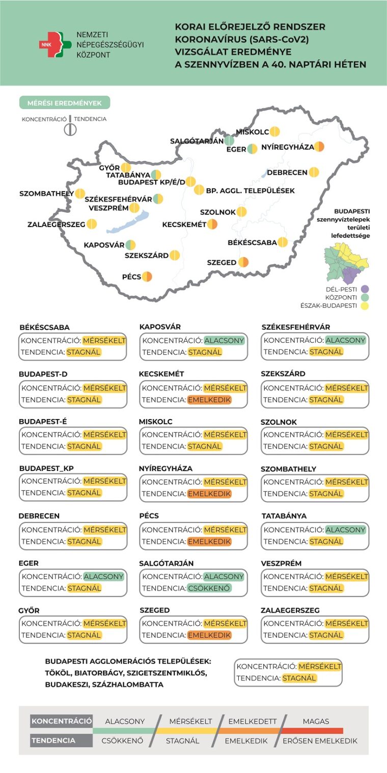 Azt írták, a szennyvízminták koronavírus-koncentrációja országos szinten továbbra is lassú ütemben növekszik. A 40. héten a vizsgált városok közül emelkedés tapasztalható Kecskeméten, Nyíregyházán, Pécsen és Szegeden, míg Salgótarjánban csökkenés látható.