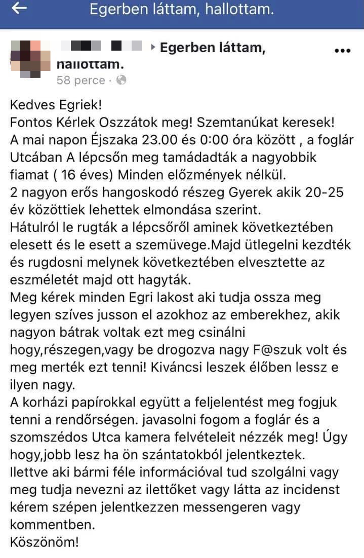 Az édesapa, közösségi oldalon (az Egerben láttam, hallottam Facebook-csoportban) fellelhető leírása szerint 16 éves fiába minden előzmény nélkül kötött bele két hangoskodó részeg. A srácot lerúgták a lépcsőn, majd ütni, rúgni kezdték. A szerencsétlen fiú elveszette az eszméletét, így hagyták ott. A szemüvege is eltört. Az apa keres szemtanúkat is, és reméli, hogy van visszanézhető kamerakép az esetről.