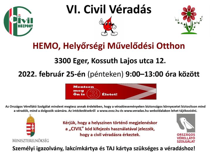 Egerben is lesz Civil véradás, február 25-én 9 és 13 óra között a HEMO-ban a Heves Megyei Civil Közösségi Szolgáltató Központ szervezésében. A programot a Depresso Éterem és kávéház támogatja.
