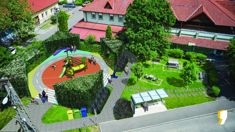 Mint elmondta – a betonos területre esésvédő gumilapok kerülnének, közepén egy nagy játszóvárral. A drótkerítés négy sarka is megmaradna, ezeket sárga lonccal vagy más, könnyen kezelhető futónövénnyel beborítva vonzóvá és különlegessé teheti a teret. A pihenősarkok kialakítása mellett egy biciklitároló és egy ivókút is elhelyezésre kerülne.