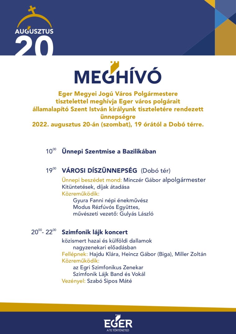 Szentmisével, városi díszünnepséggel és Szimfonik like koncerttel ünnepel augusztus 20-án Eger.