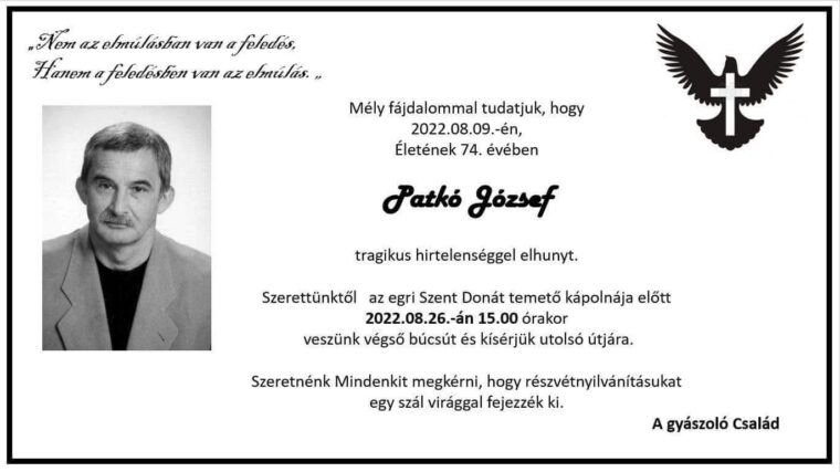 A temetés augusztus 26-án, 15 órakor lesz az egri Szent Donát temetőben. A gyászoló család azt kéri, hogy egy szál virággal róják le kegyeletüket.